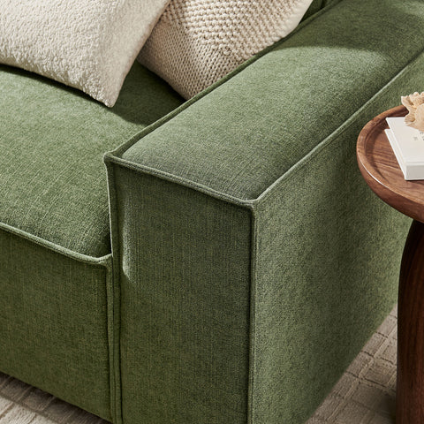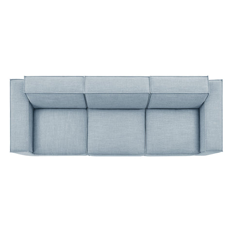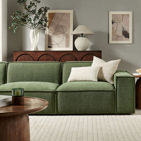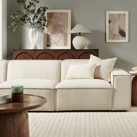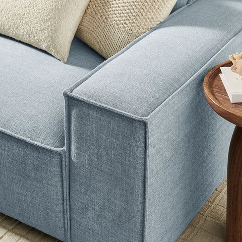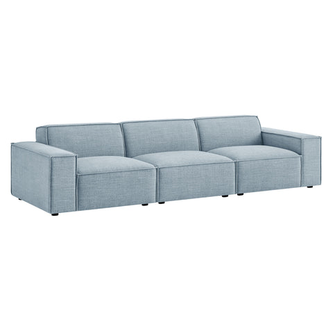 Create your custom living room and lounge area with the Restore Upholstered Fabric 3-Piece Sectional Sofa Set. The Restore Sectional Sofa appeals to minimalist elegance with a crisp design and broad lines accented with French piping details and soft fabric upholstery. Featuring a high-performance upholstery fabric designed to repel water-based spills and stains—most messes blot away easily with a clean cloth. For stubborn residue, spray with a diluted dish soap solution and blot clean. Dense foam padding and a pocket coil spring system in the cushions offer a luxe seating experience for your living room and lounge. Designed to style together or rearrange as needed, this modular set includes one left-facing armchair, one right-facing armchair and one armless chair. It can also be expanded over time by connecting with other Restore pieces using the built-in connectors. Built on a sturdy wood-blend frame with non-marking foot caps to help protect floors.