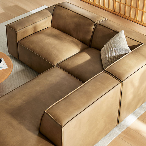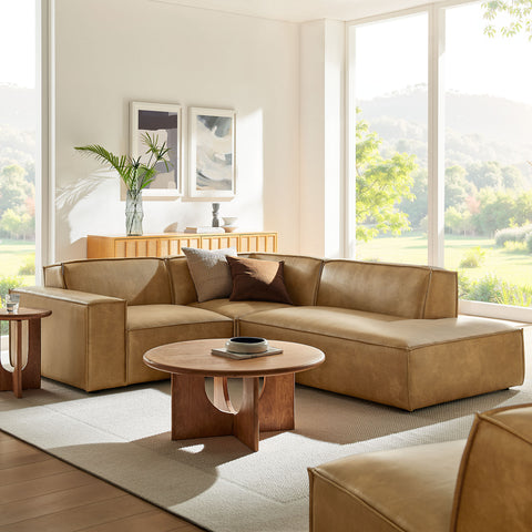 Create your custom living room and lounge area with the Restore Vegan Leather Modular Sectional Sofa. The Restore Sectional Couch features a clean, modern profile with broad lines and French piping details wrapped in soft vegan leather upholstery. Dense foam padding and a pocket coil spring system in each seat offer comfortable, supportive seating for everyday use. Designed as a compact L-shaped sectional, this 3-piece set includes one left-facing arm chair, one corner chair, and one right-facing chaise chair, creating a comfortable layout that works well in smaller living spaces. Built-in connectors keep the pieces aligned and make it easy to expand over time with other Restore pieces. Built on a sturdy wood-blend frame with non-marking foot caps to help protect floors.