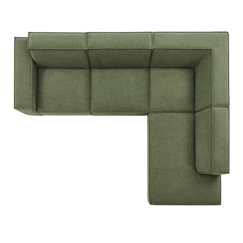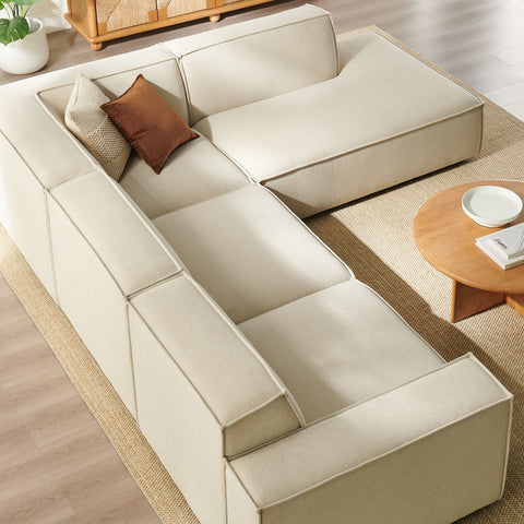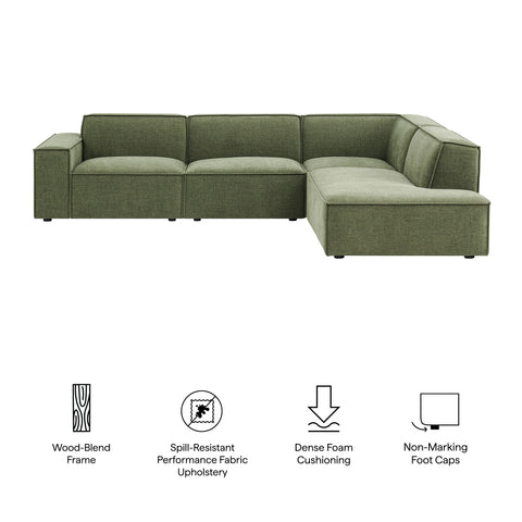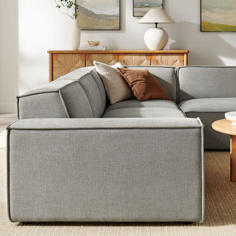 Create your custom living room and lounge area with the Restore Upholstered Fabric Modular Sectional Sofa. The Restore Sectional Couch brings minimalist appeal with a crisp silhouette, broad lines, and French piping details wrapped in soft fabric upholstery. Featuring a high-performance upholstery fabric designed to repel water-based spills and stains—most messes blot away easily with a clean cloth. For stubborn residue, spray with a diluted dish soap solution and blot clean. Dense foam padding and a pocket coil spring system in each seat offer a comfortable, supportive feel for everyday lounging. Designed as a compact L-shaped sectional, this 4-piece set includes one left-facing armchair, one armless chair, one corner chair, and one right-facing chaise. Built-in connectors keep the pieces aligned and make it easy to expand over time with other Restore pieces. Built on a sturdy wood-blend frame with non-marking foot caps to help protect floors.