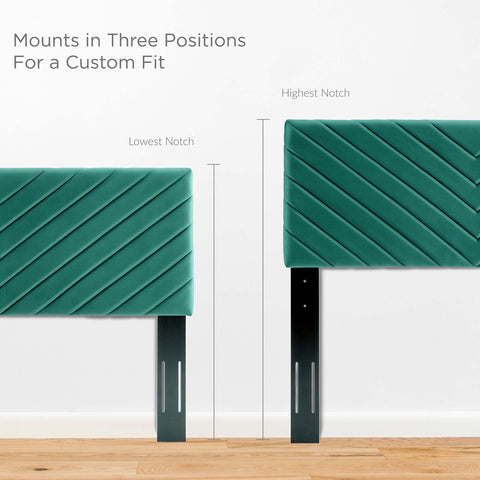 Update your master bedroom or guest room with glam deco decor with the Roxanne Chevron Tufted Performance Velvet Queen Platform Bed. With a squared profile, this queen bed grants a luxurious presence to your bedroom with its angular channel tufted detail and vintage modern style. The padded queen headboard and side rails come covered in soft, stain-resistant performance velvet upholstery that grants rich texture to the luxurious design. Resting atop tapered black wood legs, this platform bed frame crafted with MDF and LVL is a sturdy mattress foundation for memory foam, innerspring, latex, and hybrid mattresses. With supporting legs and a reinforced center beam, this upholstered bed is complete with a poplar wood slat support system that offers lasting stability and healthy air circulation. Mattress not included. Assembly required. Queen Bed Weight Capacity: 800 lbs.