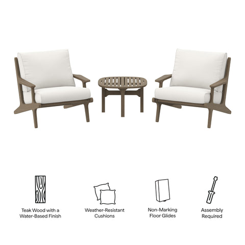 Refresh your outdoor space with the Saratoga 3-Piece Patio Furniture Set. Expertly crafted from durable teak wood with a water-based finish that highlights its natural grain, this backyard furniture set includes two lounge chairs and a side table. The lounge chairs feature an angular frame with sculpted armrests, slatted seat foundations, and plush seat and back cushions covered in weather-resistant, water-repellent, and stain-resistant fabric for easy maintenance and year-round relaxation. The side table boasts a beautifully slatted top with an intersecting stretcher base, offering both durability and a refined silhouette. Perfect for patios, porches, and outdoor lounge areas, the Saratoga 3-Piece Patio Set blends modern design with timeless craftsmanship. Assembly required.