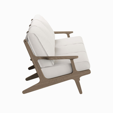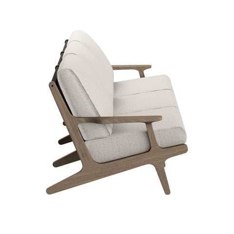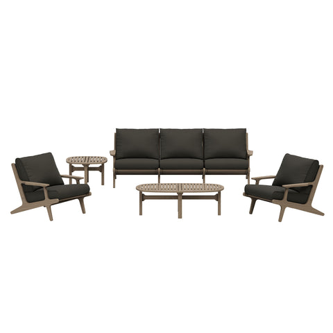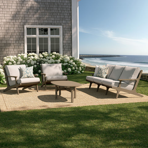 Refresh your outdoor space with the Saratoga 4-Piece Patio Furniture Set. Expertly crafted from durable teak wood with a water-based finish that highlights its natural grain, this backyard furniture set includes a sofa, two lounge chairs, and a coffee table. The sofa and lounge chairs feature an angular frame with sculpted armrests, slatted seat foundations, and plush seat and back cushions covered in weather-resistant, water-resistant, and stain-resistant fabric for easy maintenance and year-round relaxation. The coffee table boasts a beautifully slatted top with an intersecting stretcher base, offering both durability and a refined silhouette. Perfect for patios, porches, and outdoor lounge areas, the Saratoga 4 Piece Patio Set blends modern design with timeless craftsmanship. Assembly required.