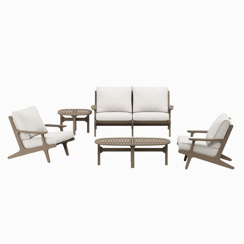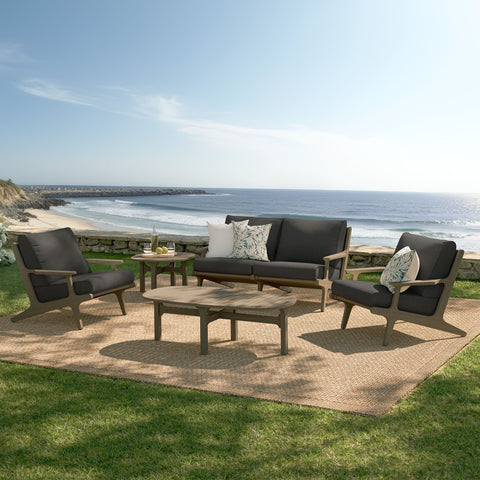 Refresh your outdoor space with the Saratoga 5-Piece Patio Furniture Set. Expertly crafted from durable teak wood with a water-based finish that highlights its natural grain, this backyard furniture set includes a loveseat, two lounge chairs, a coffee table, and a side table. The loveseat and lounge chairs feature an angular frame with sculpted armrests, slatted seat foundations, and plush seat and back cushions covered in weather-resistant, water-resistant, and stain-resistant fabric for easy maintenance and year-round relaxation. The coffee and side tables boast a beautifully slatted top with an intersecting stretcher base, offering both durability and a refined silhouette. Perfect for patios, porches, and outdoor lounge areas, the Saratoga 5 Piece Patio Set blends modern design with timeless craftsmanship. Assembly required.