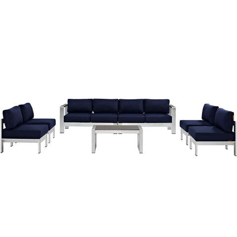 Enjoy your patio or backyard leisure time with the strong and durable Shore Outdoor Patio Collection. Made of anodized brushed aluminum frames and non-marking black plastic foot caps, Shore Outdoor Sectional Sofa pieces come outfitted with resilient fabric canvas tested to last through all weather conditions. The Shore Outdoor Patio Sectional Furniture Set complements casual gatherings with a chic look and ready versatility you can rely on.