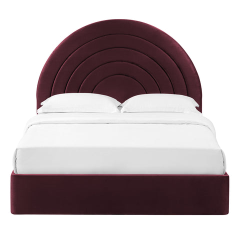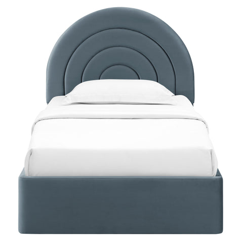 Bring sweeping lines and cozy comfort to your bedroom with the Solana Twin Velvet Platform Bed. Featuring a captivating arch-shaped headboard, the design showcases three layered, semi-circular padded segments that add depth and dimension to the look. Upholstered in luxe, stain-resistant performance velvet, the twin size headboard’s plush layers create a striking focal point that is both modern and calming. Supported by sturdy wood slats, the twin size platform bed frame offers excellent mattress support without the need for a box spring. The upholstered plinth-style base mirrors the soft, cushioned look of the rounded headboard, adding to the bed's contemporary appeal. Whether you're redesigning a guest room or college dorm, or transitioning to a twin size kid's bed, the Solana twin upholstered bed frame is the perfect blend of artistic style and functionality. Assembly required. Weight Capacity: 800 lbs.