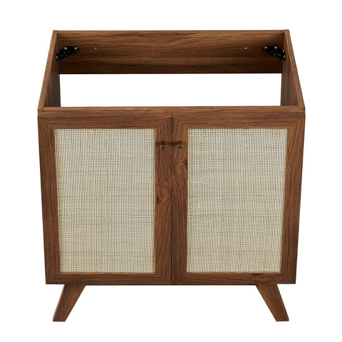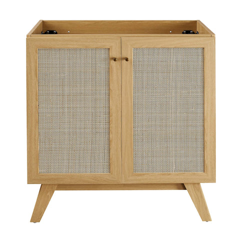 Introduce refreshing style to your restroom with the Soma 18" Bathroom Vanity Cabinet. Showcasing a beautiful rattan weave on the cupboard door, this vanity cabinet brings organic aesthetics and modern functionality to any bathroom or powder room. Crafted from durable MDF and particleboard with a natural wood grain finish, this cabinet features an adjustable shelf, providing easy customization for arranging towels, toiletries, and bathroom necessities. Complete with a metal doorknob with a brushed gold finish and soft-close hinges, this bathroom vanity cabinet is designed for quiet and effortless functionality. Resting on splayed legs, the Soma Bathroom Vanity includes non-marking foot caps to protect flooring. Assembly required. Fixtures and sink basin not included. Weight Capacity: 200 lbs.