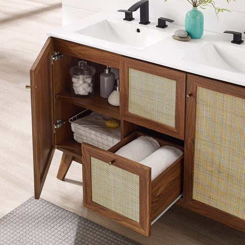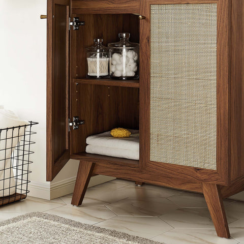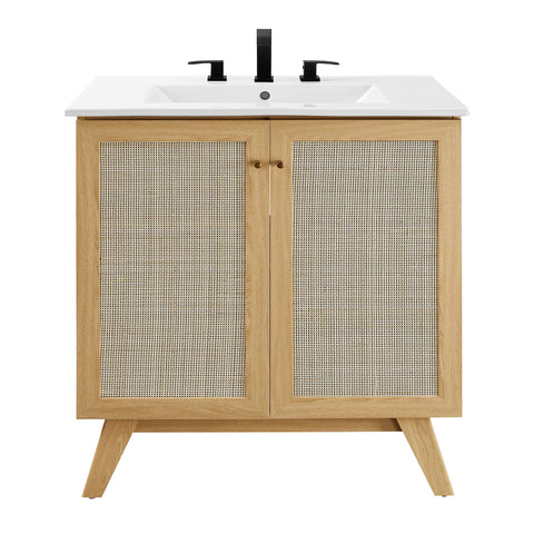 Introduce refreshing style to your restroom with the Soma 18" Bathroom Vanity. Showcasing a beautiful rattan weave on the cupboard door, this vanity brings organic aesthetics and modern functionality to any bathroom or powder room. Crafted from durable MDF and particleboard with a natural wood grain finish, this vanity boasts a ceramic sink basin with 8-inch widespread holes and an integrated countertop. This vanity features an adjustable shelf, providing easy customization for arranging towels, toiletries, and bathroom necessities. Complete with a metal doorknob with a brushed gold finish and soft-close hinges, this bathroom vanity cabinet is designed for quiet and effortless functionality. Resting on splayed legs, the Soma Bathroom Vanity includes non-marking foot caps to protect flooring. Assembly required. Fixtures not included.