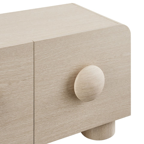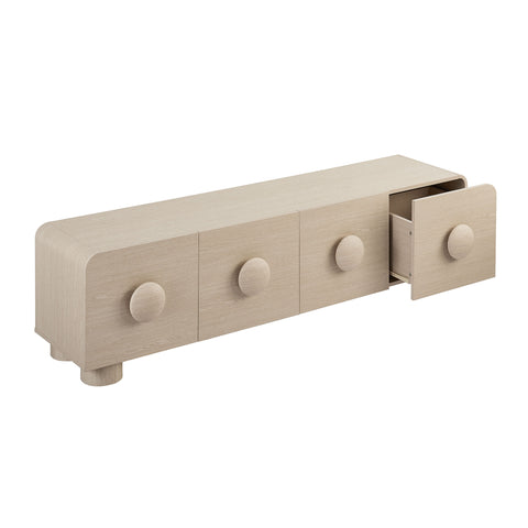 Experience the timeless appeal of the Sonnet Retro Low TV Stand that combines modern design with practical functionality. This 69" TV stand features rounded corners and circular handle pulls that resemble giant buttons, adding a whimsical touch to its sleek aesthetic. Constructed with a durable blend of materials and finished with a wood grain paper laminate, this retro TV stand is both stylish and sturdy. Perfect as a home entertainment center, Sonnet boasts four spacious drawers that provide ample storage for media essentials, gaming consoles, home accessories, and more. Versatile in use, Sonnet can accommodate wall-mounted TVs up to 76 inches, making it an ideal modern media console for your living room, office, or entertainment space. Resting on simple legs with non-marking foot glides, this low profile TV stand with drawers requires assembly. Weight Capacity: 220 lbs.
