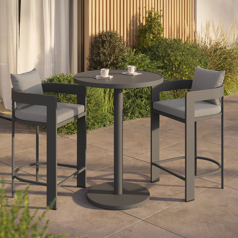 Enliven your alfresco spaces with the Tahoe Outdoor Patio 3-piece Bar Set. Built with durable aluminum frames and finished in a smooth powder-coated finish, this bar table and chairs set brings a clean, modern look to outdoor spaces. The set includes one round bar-height table and two matching bar chairs for drinks, casual meals, and easy conversation. Featuring a slatted tabletop with smooth edges and coordinating slatted chair seats, Tahoe wipes down easily and stays simple to maintain. With easy assembly and adjustable plastic foot pins to help keep it level on uneven surfaces, this patio bar set for 2 is made for everyday outdoor dining. Table Weight Capacity: 177 lbs. Chair Weight Capacity: 300 lbs. Each.