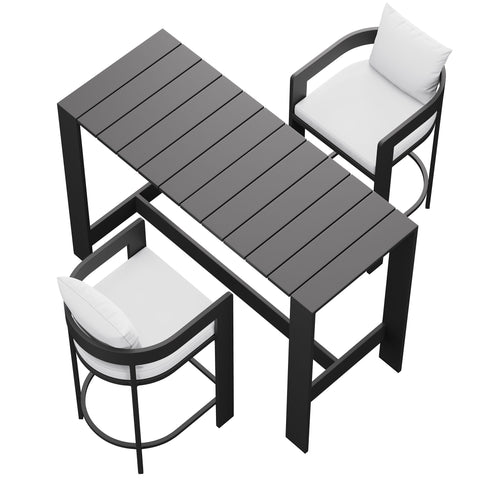 Enliven your alfresco spaces with the Tahoe Outdoor Patio 3-piece Bar Set. Built with durable aluminum frames and finished in a smooth powder-coated finish, this bar table and chairs set brings a clean, modern look to outdoor spaces. The set includes one rectangular bar-height table and two matching bar chairs for drinks, casual meals, and easy conversation. Featuring a slatted tabletop with smooth edges and coordinating slatted chair seats, Tahoe wipes down easily and stays simple to maintain. With easy assembly and adjustable plastic foot pins to help keep it level on uneven surfaces, this patio bar set is made for everyday outdoor dining. Table Weight Capacity: 221 lbs. Chair Weight Capacity: 300 lbs. Each.