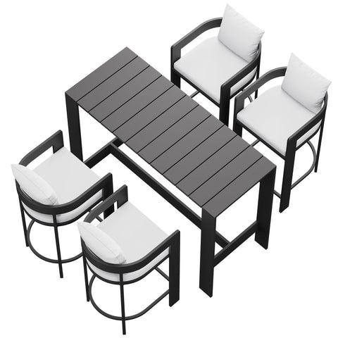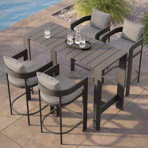 Enliven your alfresco spaces with the Tahoe Outdoor Patio 5-piece Bar Set. Built with durable aluminum frames and finished in a smooth powder-coated finish, this bar table and chairs set brings a clean, modern look to outdoor spaces. The set includes one rectangular bar-height table and four matching bar chairs for drinks, casual meals, and easy conversation. Featuring a slatted tabletop with smooth edges and coordinating slatted chair seats, Tahoe wipes down easily and stays simple to maintain. With easy assembly and adjustable plastic foot pins to help keep it level on uneven surfaces, this patio bar set is made for everyday outdoor dining and gatherings. Table Weight Capacity: 221 lbs. Chair Weight Capacity: 300 lbs. Each.