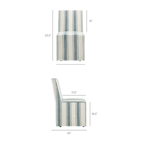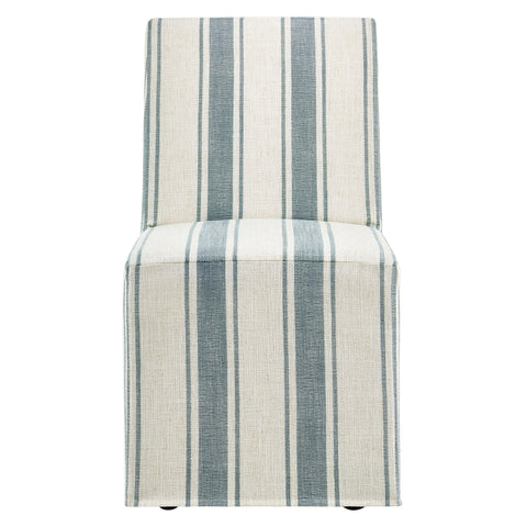 The Tessera Slipcovered Dining Side Chair brings a refined yet casual touch to everyday dining. Upholstered in a linen-like fabric, this striped dining chair features a tailored removable slipcover that adds versatility and style. The padded seat and tall backrest provide supportive comfort, while the clean Parsons silhouette makes it a timeless addition to any dining room, kitchen, or entryway. Set on a kiln-dried wood frame, this slipcovered parsons dining chair is built to last. Hidden casters underneath offer smooth mobility, making it easy to glide into place around the table. Blending modern farmhouse, coastal, and minimalist influences, this upholstered dining chair is as practical as it is stylish. Assembly required.