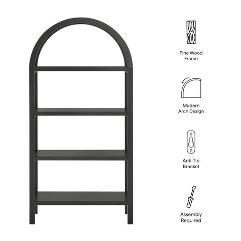With its sculptural curves and modern take on classic arches, the Vexley Arched Bookshelf brings an artful edge to any space. Ideal for showcasing curated objects, favorite reads, or design-forward accents, this 60 inch open shelf bookcase plays with negative space and architectural curves, bringing an airy, artful touch to blank walls or creative corners. Built from a pine wood frame and shelves, Vexley offers both strength and style. For added safety, it includes an anti-tip bracket on one of the middle shelves and non-marking glides to protect flooring. A true conversation starter, this arch bookshelf adds sculptural depth without visual clutter, blending modern form with effortless display potential. Assembly required. Weight Capacity: 220lbs.